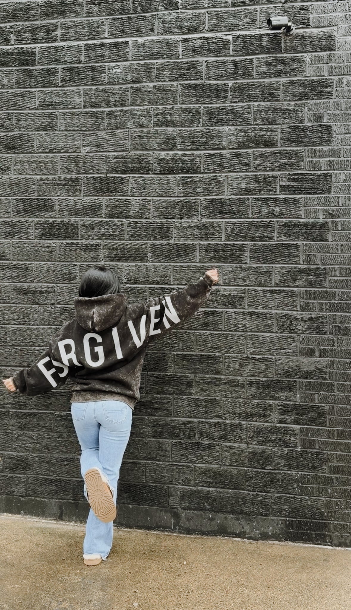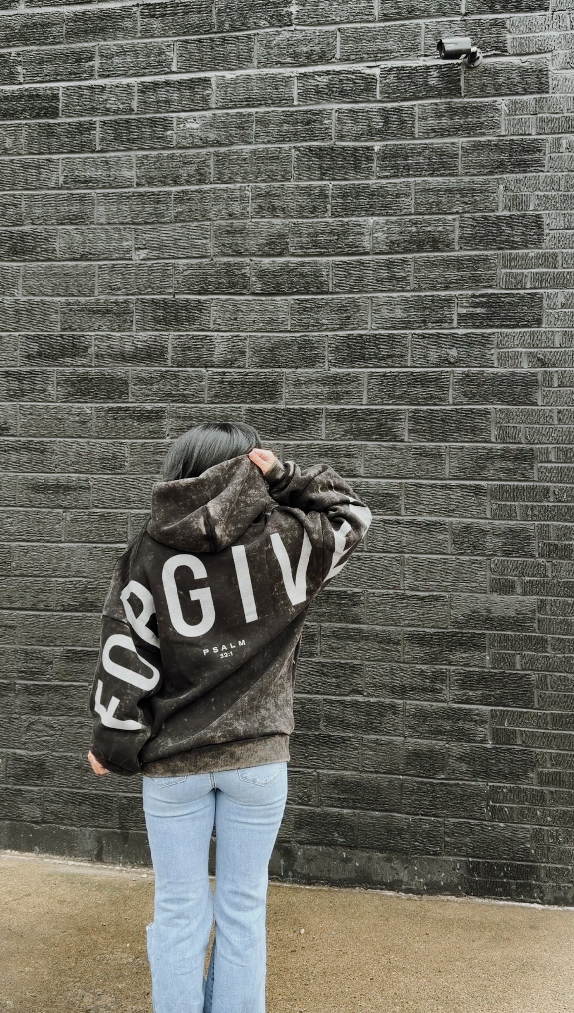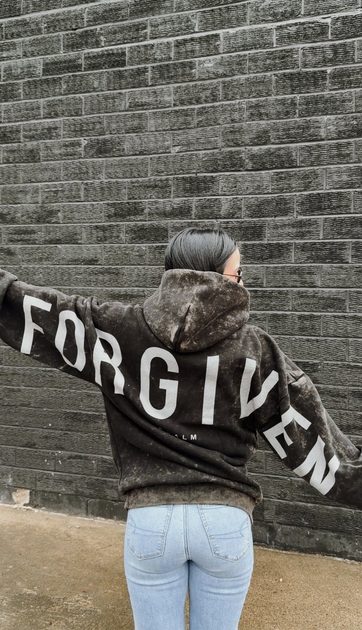 Gods Love Overcomes oversized hoodie. FORGIVEN across the back, psalm 32:1
